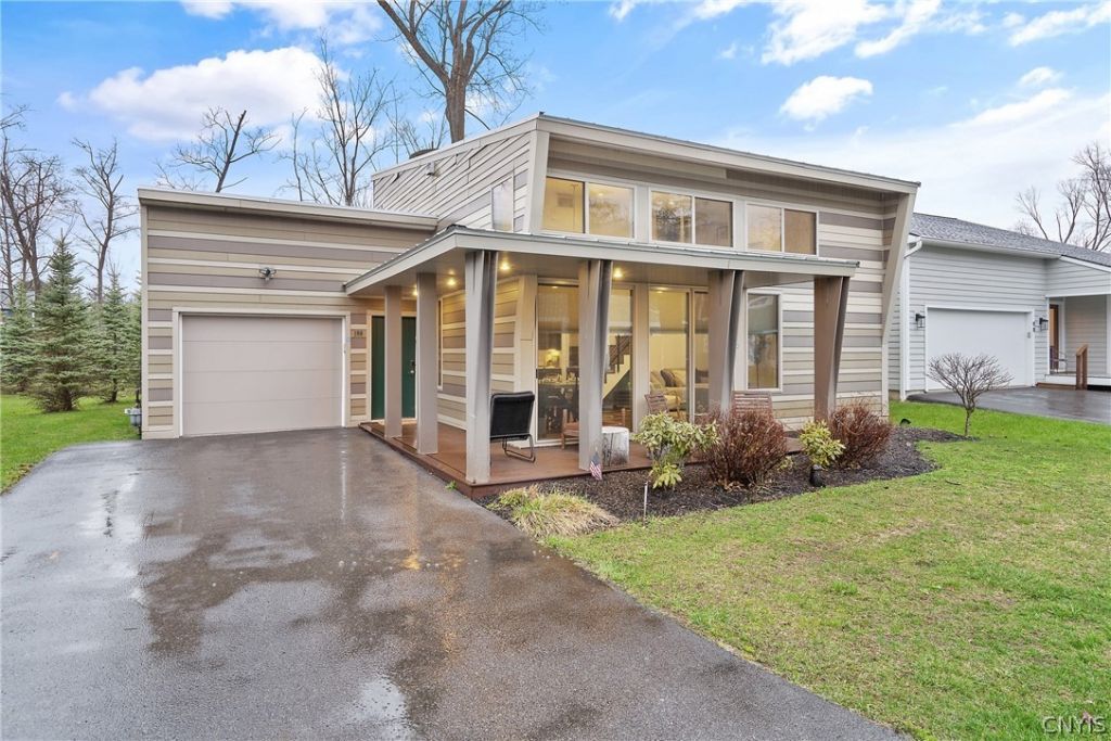Welcome to 100 Xavier Circle-where modern design meets effortless living in one of Syracuse's most unique and architecturally distinctive enclaves named Xavier Woods. Built in 2015, this contemporary 2-bedroom, 2 bath home offers a rare combination of clean design, thoughtful layout, and low-maintenance lifestyle just minutes from Syracuse University. Step inside to an open-concept main level flooded with natural light from dramatic floor-to-ceiling windows. Vaulted ceilings elevate the living and dining spaces, creating an airy, expansive feel, while a cozy corner gas fireplace adds warmth and character. The kitchen is designed for both function and style, featuring a large quartz island ideal for gathering, entertaining, or everyday living. Whole house radiant heated tile floors-designed to mimic the look of wood-run throughout the home, offering both durability and comfort during Central New York winters. The primary bedroom has brand new LVP floors. The second floor is dedicated almost entirely to a private primary suite retreat. Enjoy a spacious bedroom filled with natural light, two closets including a walk-in, and the convenience of second-floor laundry. The full bath is thoughtfully designed with a separate soaking tub and stand-up shower, creating a spa-like experience at home. Outside, relax on the covered front porch or enjoy the back patio-perfect for low-maintenance outdoor living. A spacious one-car garage adds convenience and additional storage. The garage has radiant heat in the slab as well. Situated in a quiet circular neighborhood known for its modern, newer construction homes, this property offers a rare opportunity to own a distinctive, contemporary home in a highly desirable location south of Syracuse University. The HOA takes care of common area maintenance, landscaping, lawn mowing, AND snow plowing! Whether you're looking for simplicity, style, or a turnkey lifestyle-this home delivers.