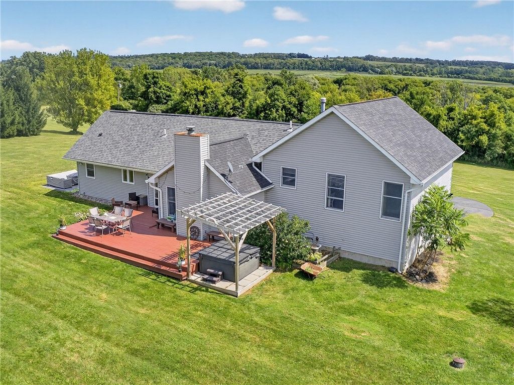 Updated split-level home with contemporary features, set on a scenic and spacious 3-acre lot offering beautiful views and added privacy. A recent addition (2022) showcases a stunning open-concept kitchen and dining area with both island seating and space for a full dining table, along with a convenient first-floor primary suite featuring a private en suite bath. This 4-bedroom, 3-bath home is set back from the road and partially bordered by mature trees, creating a natural buffer and peaceful setting. The bright, updated kitchen features a farmhouse sink, subway tile backsplash, solid surface countertops, and a full suite of stainless steel appliances-including a refrigerator, dishwasher, drawer microwave, wine chiller, and stove with pot filler and hood vent. Sliding glass doors lead to a large rear wooden deck complete with a pergola-covered hot tub-perfect for relaxing or entertaining. Outdoor living continues with a side patio finished with pavers and inviting seating areas overlooking both the front and back yards. Inside, spacious living room offers a vaulted ceiling with fan and a wood burning fireplace highlighted by a floor-to-ceiling natural stone mantel, raised hearth, and surround. Lower level/basement area has finished space that can be used as an office, family room or convert to another bedroom. The covered front porch entry features a hard-scaped, stepped walkway leading from the attached two-car garage and paved driveway. Home access inside entry from this garage as well. In addition, a versatile pole barn/garage is heated with electric in the backyard offering endless possibilities for extra parking (up to two vehicles), extra storage, a workshop, or even a home gym. Ideally located in Avon, this property offers the perfect blend of peaceful country living with convenient access to local amenities, schools, and commuter routes. Delayed showings until April 17 at 1pm. Delayed negotiations until April 21 at 6pm. Open house - Saturday, April 18th and Sunday, April 19th from 1pm to 3pm.