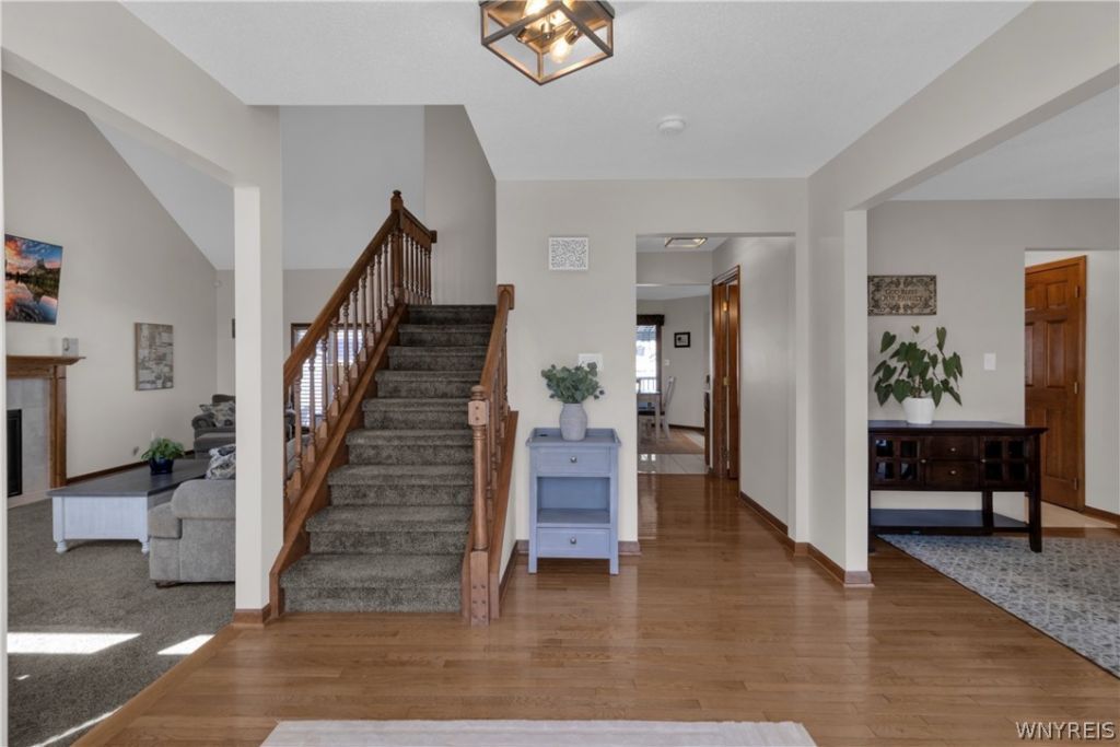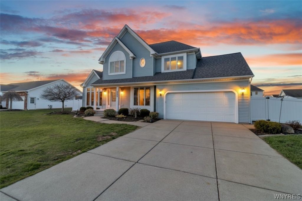 Welcome Home to 3319 Blossom Lane in Wheatfield Heights. This stunning Contemporary Colonial in Niagara Wheatfield Schools built by G.T. Custom Homes features a spacious and open main floor plan perfect for everyday living and entertaining. A maintenance-free vinyl exterior and covered front porch welcome you into a large entry foyer and dining room with gleaming hardwood. The living room with soaring ceilings and windows at the front and back of the house brings an abundance of natural light into the space. The granite kitchen boasts solid wood cabinetry, stainless appliances, multi-purpose work area and walk-in pantry. A convenient laundry utility room and renovated half bath complete the first floor. Upstairs you will find three generous bedrooms with updated light fixtures, fresh carpeting and neutral paint. The expansive primary retreat offers a spa-like bath with a jacuzzi tub, walk-in shower, double sink vanity and a walk-in closet. The second full bath has been refreshed with new lighting and luxury vinyl flooring. Additional recent improvements include a brand new hot water tank (2026), a high-efficiency furnace (2022), central air (2019), garage door and fireplace surround (2023). The backyard oasis has been completely transformed since 2024 including a brand new privacy fence, a composite deck with a Custom Canvas awning, a hot tub, an above-ground pool and custom-built storage shed. Offers will be reviewed starting Thursday, April 23rd at 12pm.
