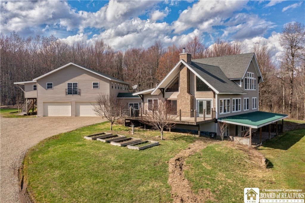 A retreat unlike any other-where everyday life fades and nature takes center stage. This is more than a home; it's a private escape for you, your family, and your closest friends. Tucked deep off the road on approximately 44 acres of unspoiled beauty, this property offers complete seclusion and a rare sense of freedom. Step outside and immerse yourself in the ultimate outdoor lifestyle. With direct access to snowmobile trails, a short drive to Chautauqua Lake, exceptional hunting opportunities, a stocked pond, winding trails, and peaceful creeks, every season brings a new adventure. Whether you're exploring, relaxing, or entertaining, this is a place designed to be experienced. The newer home boasts over 6,000 square feet of finished space(inc. 1667sqft finished basement), blending rustic charm with modern comfort. The main living area impresses with soaring ceilings, stunning timber framing, and walls of windows that flood the space with natural light and frame breathtaking seasonal views. At its heart, a striking floor-to-ceiling stone fireplace anchors the living room, creating an atmosphere that is both grand and inviting. The open-concept kitchen overlooks the living space, making it perfect for gathering and entertaining, while the formal dining room sets the stage for memorable holiday meals and intimate dinners alike. Upstairs, the primary suite offers a private sanctuary with serene views of the pond, generous closet space, and a spa-like ensuite featuring a walk-in shower and soaking tub. The lower level expands the living space even further with an additional lounge area, two private suites-each with full baths and custom closets-and a dedicated office. Above the garage you'll find living space which includes a private office, bedroom, two full baths, and ample storage-ideal for hosting guests, accommodating extended family, or creating an income-generating opportunity. The unfinished space below has served as a game room and gym, ready to be customized to fit your vision. This is more than a property-it's your personal wilderness playground, a place to recharge, reconnect, and truly live.