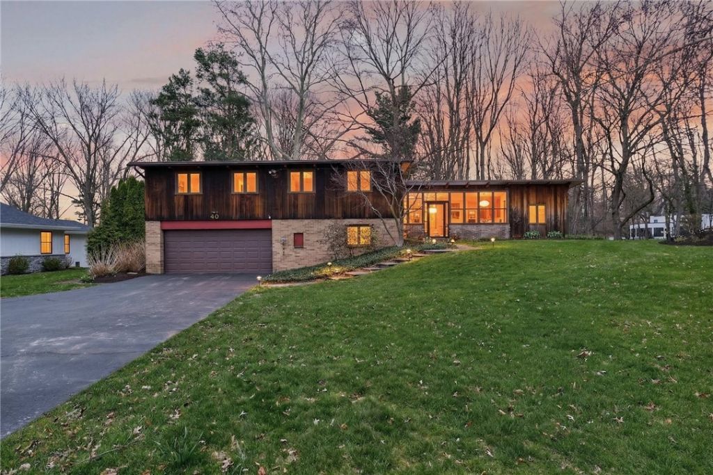 Mid-Century Modern on the Fairway-straight out of a vintage magazine! Set along Oak Hill Country Club and steps to Irondequoit Country Club, this one-of-a-kind home delivers serious style paired with a peaceful private setting. ~~~ Soaring ceilings with dramatic wood beams, walls of windows and skylights fill the home with natural light, while a stunning stone fireplace anchors the main living space.-the kind of space that begs for a cocktail party or a quiet night by the fire. Golf course views create a beautiful backdrop and the multi level layout adds character & flow giving everyone their own space and flexibility for everyday living and entertaining. ~~~ The kitchen blends vintage charm with modern function, opening to the dining area for easy gatherings. Highlights are the soaring ceiling, pantry wall and yes those are stainless counters! With 4 bedrooms and 2 full updated baths, you get the best of both worlds-classic design with modern comfort. ~~~ The walk-out lower level is ready for movie nights, workouts, or guests, plus a wine cellar and loads of storage. A whole-house generator keeps life running smoothly. Outside, A private, tree-lined yard with that 'tucked away feel-plus a sunroom/greenhouse space perfect for a coffee break or for your green thumb! A large patio offers Mad Men meets Pittsford vibe-with a golf course view. ~~~ +Vintage Style- Modern Living +Multi Level +Mid Century Modern Dream +Soaring Ceilings & Wood Beams +Greenhouse +First floor office +Wine Storage +Generator 2004 + Roof 2015 +Furnace/Boiler 2005 +Hot Water 2013 +Square footage is 2392 Plus 393 in finished walk out basement. +Greenhouse and unfinished basement not included in SF +Minutes to Pittsford Village, Colleges, Expressways & More! ** See Update & Highlights List ** Showings start Thurs 4/16 at 10am. Delayed Negotiations Mon 4/20 at 5PM. ~~ LIFE IS FULL OF MEMORIES & HERE IS A WONDERFUL PLACE TO KEEP THEM!