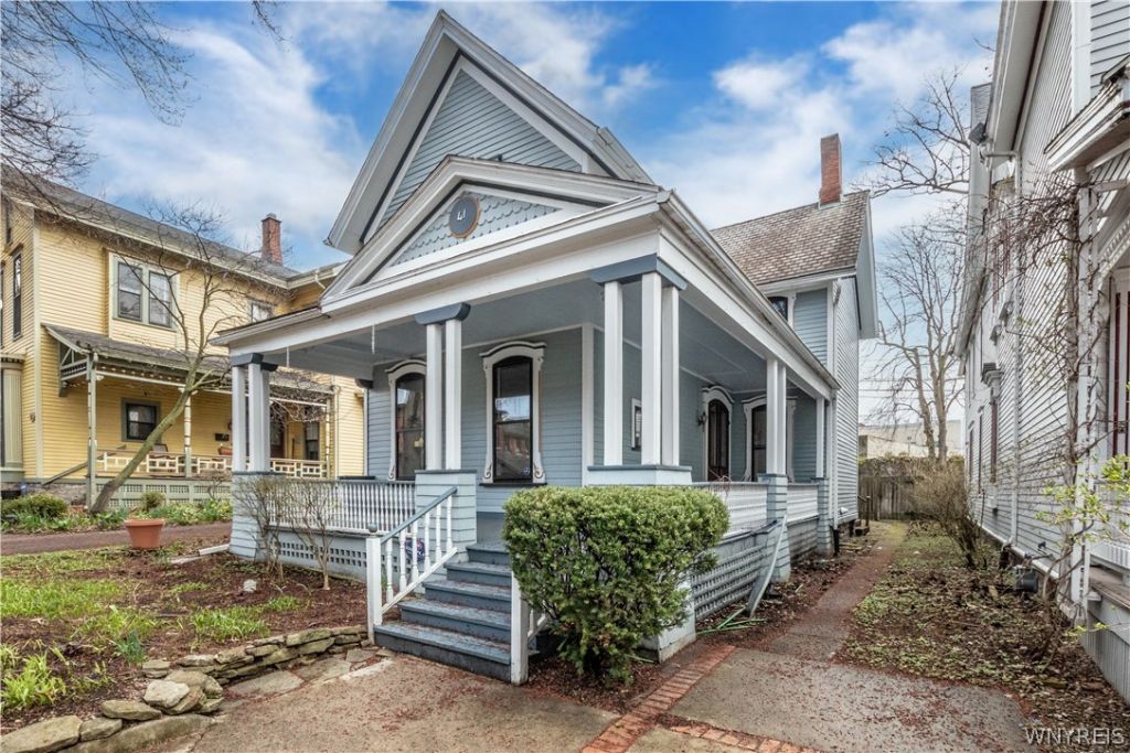 Welcome to this lovely Victorian in the heart of Allentown! Rich in character and timeless elegance, this home showcases beautiful hard wood floors, soaring windows that flood the space with natural light, and exquisite turn-of-the-century details throughout. A spacious wraparound front porch overlooking lush gardens sets the tone and warmly welcomes you to 41 Irving. Inside, the inviting foyer features a graceful, curved staircase, opening into a stunning double living room complete with a fireplace (NRTC), built-in bookcases, and original ceiling medallions. The formal dining room is perfect for entertaining, with a Victorian chandelier that has luminescent glass shades, abundant natural light, convenient powder room access, and a secondary staircase. A charming butler's pantry provides additional storage and functionality. The generously sized eat-in kitchen offers ample cabinetry and a bright breakfast area, with sliding glass doors leading to a deck and private backyard. A versatile front room with a fireplace (NRTC) can serve as a parlor, home office, or den. Upstairs, the spacious primary bedroom features a decorative fireplace, a hallway walk-in closet adds additional storage. Three additional bedrooms and two full baths provide plenty of space, including one beautifully updated bath with a glass-enclosed shower, basket-weave tile, and modern vanity. Additional highlights include central air, The private backyard is a true retreat, featuring a deck with a new automatic Kohler awning, a tranquil koi pond, and thoughtfully designed landscaping. Ideally located near Downtown, Elmwood Village, Delaware Park, the AKG Museum, the medical campus, and more-this is a rare opportunity to own a piece of Buffalo's architectural history.