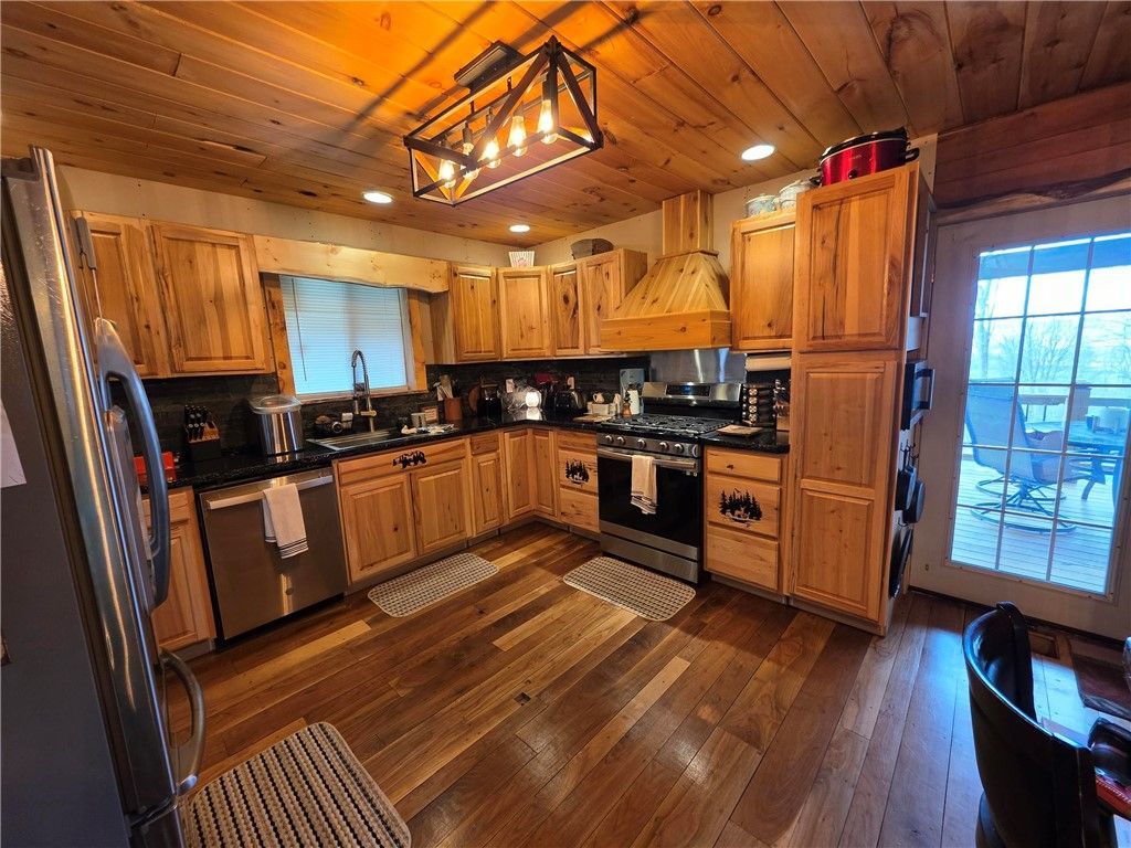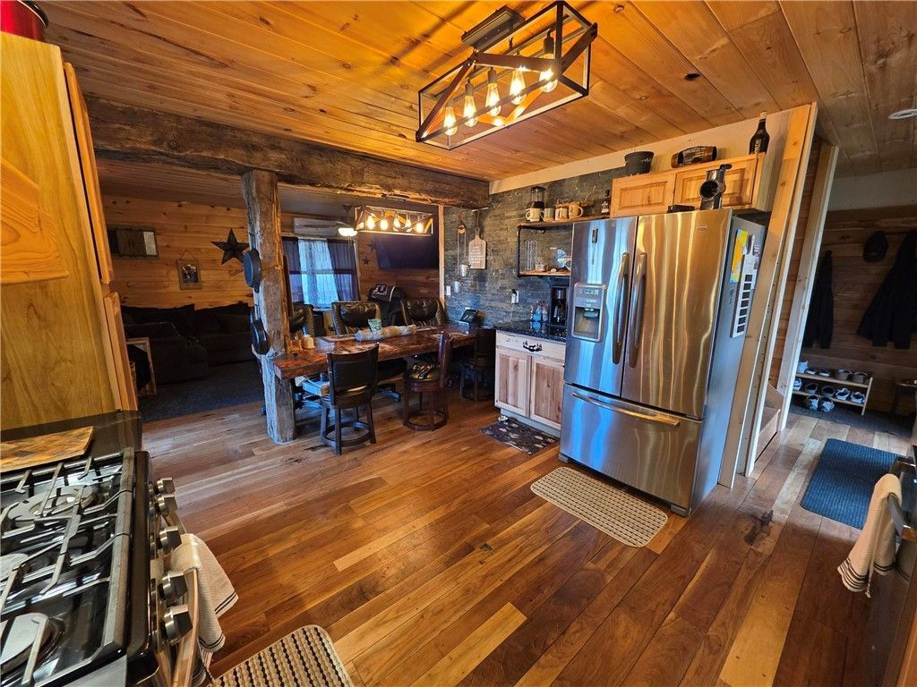 Escape to your own private haven in the heart of Bradford, NY with this stunning log sided cabin retreat. Nestled amidst 3.2 acres of parklike setting, this remarkable property offers tranquility and peace. The centerpiece of the estate is a beautifully crafted 5 bedrooms 2 full bathroom 2 half bathroom home that exudes rustic charm yet boasts modern comforts with custom finishes throughout. For the car enthusiast or hobbyist, an impressive 3 bay garage/shop awaits, complete with an accessory 1 bedroom 1 bathroom apartment above - perfect for guests or rental income potential. Garage has electricity, heat, bathroom, laundry, lots of storage space and a lift for ease of working on vehicles. Embrace nature's beauty by strolling along the serene pond accompanied by a gentle stream, creating an idyllic backdrop for relaxation and reflection. Entertain family and friends on warm summer days beside the sparkling above ground pool or enjoy cozy nights on your spacious wrap around covered porch. Full basement offers a half bathroom, beautifully crafted log stairs and walkout access. With its unique blend of function and rustic allure set against breathtaking natural surroundings, this property captures the essence of a dream escape, while providing functional spaces. Discover unparalleled privacy and lifestyle at its finest; make this retreat yours today!