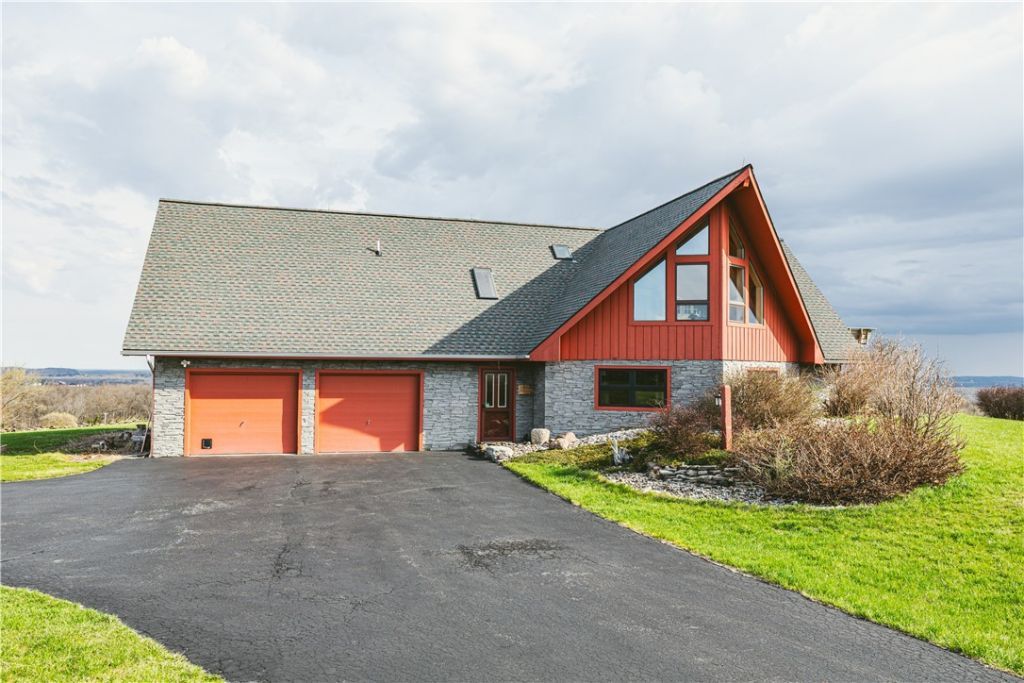 Welcome to 6520 N Avon Road, a distinctive property set on more than 13 acres of rolling countryside, where architectural character meets wide-open views and modern efficiency! Perched to capture the surrounding landscape, the main living spaces are positioned on the upper level. Natural light pours through expansive windows, and vaulted wood ceilings create an open, inviting atmosphere. The living room serves as the centerpiece, flowing into the formal dining room, where a half bathroom and small office are conveniently located just off the space. From there, the layout connects naturally to the kitchen and adjoining family room or den, creating open yet defined living areas. The kitchen is well-appointed with a reverse osmosis water filtration system and direct access to the deck, offering easy connection to the yard and views of fields and wildlife. One of the primary suites is also located on this level, offering convenience along with its own private bathroom. The lower level is designed with versatility in mind. A welcoming mudroom provides practical everyday entry. Three additional bedrooms and two full bathrooms are located here, including a second primary suite with its own private bathroom and sliding glass door leading directly outside, ideal for guests or extended living arrangements. A multi-purpose room, currently used as a laundry room, has previously served as a study and even an additional bedroom, offering flexibility as needs evolve. Beyond the home itself, the property continues to impress. A two-car garage is attached directly to the house for everyday convenience, while just a short walk away a substantial 30 x 50 pole barn and additional garage space provide exceptional room for vehicles, equipment, hobbies, or storage. Solar panels, a geothermal heating and cooling system, and a 50-year architectural-grade roof add long-term efficiency and durability. Surrounded by open fields and abundant wildlife, this home offers a country setting while remaining just minutes from the Village of Honeoye Falls. 6520 N Avon Road blends space, efficiency, and flexibility in a truly special setting! Offers to be reviewed, April 21st at 12pm.