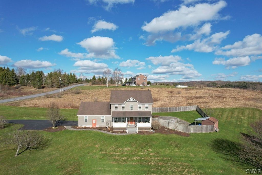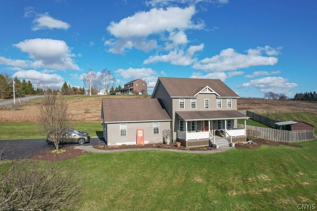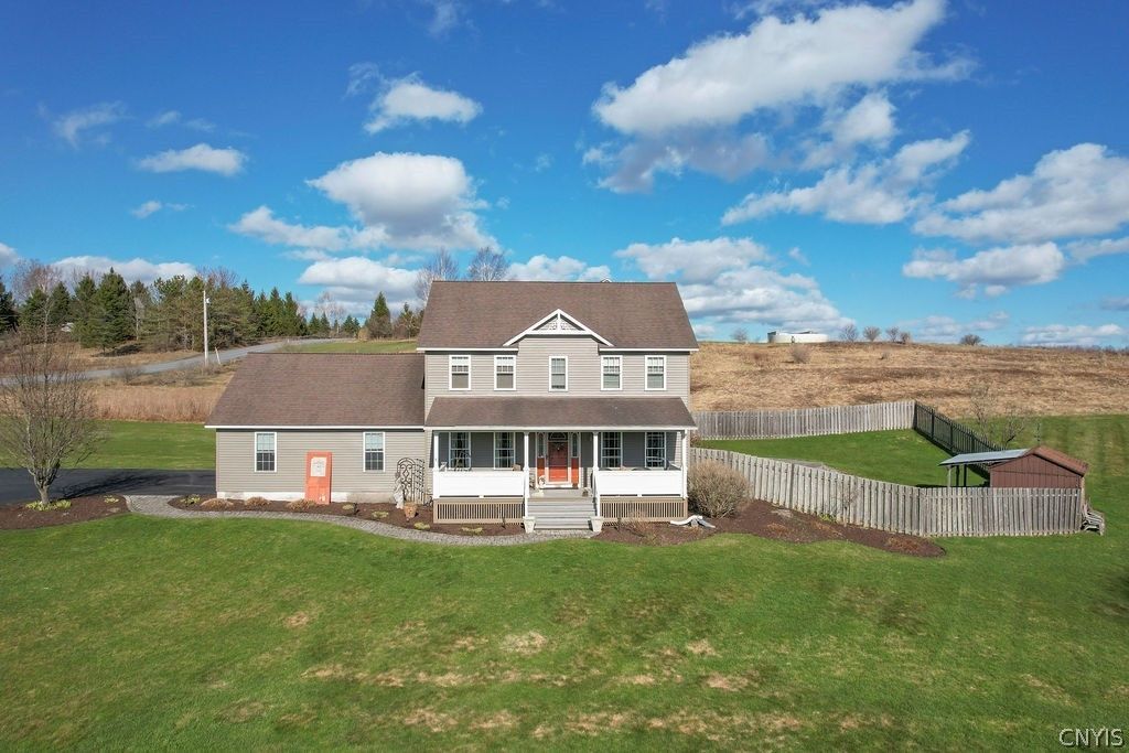 Located just 2 miles from the heart of the beautiful and historic Village of Hamilton, NY, this classic colonial sits perched on 5 acres with lovely hillside views, a smart floorplan, partially fenced yard, outdoor entertaining area, and more! Inside you'll find an efficient layout- an open kitchen with granite counters and warm wood cabinetry has a dining area, doors to the backyard, and it leads to the comfy family room and it's wood burning fireplace; across the front of the house is a formal living room and formal dining- which has also served as an office. Upstairs you'll find 2 nicely sized guest rooms, a full bath, and a primary suite with attached full bath. The basement offers tremendous potential- with a full bath and lots of space, it could easily be finished for more living or rec space. Outside you'll love the front porch for sunsets and the charming fire pit and shed-bar area for entertaining and relaxing (think Spring!). There's also an attached garage with a mudroom nook entry into the house. You can't beat the combination of quiet country living and easy access to the village, Seven Oaks Golf Course, or Colgate University... Enjoy everything that Hamilton has to offer from this sweet home!