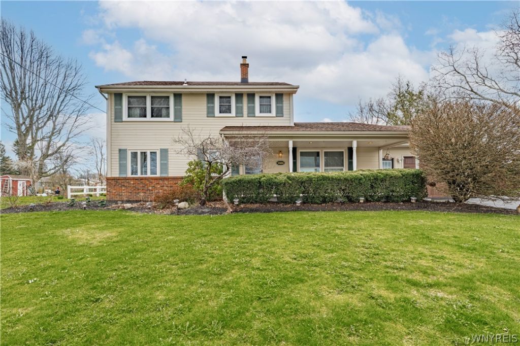 Very well maintained 3 bedroom 2 full bath colonial! Starting with the inviting covered front porch, this home features a freshened-up, fully-applianced kitchen (including SS refrigerator, dishwasher and stove) beautiful cabinetry and breakfast bar, along with a spacious eating area with ceiling fan. The kitchen and eating area lead into a beautiful four season family room with a vaulted ceiling, skylights and a updated sliding door! Walk out the sliding glass doors to the stamped concrete pad and above ground 24' diameter pool (2023) with a deck! There is also a formal living room with an updated picture window and built-in desk/workspace, along with ANOTHER family room with plenty of play space that has a brick accent wall and gas stove (NRTC). Any one of these three sitting rooms would make a great formal dining room! The second floor features another full bath and three bedrooms, including a primary bedroom with two closets, with one being a walk-in. Central air on the first floor. Most windows have been updated. Extra large heated tandem garage (almost 50 ft long) with pull down stairs to attic, and front and back garage doors, and it can fit close to three cars! Full basement for additional storage with finished room. This home also features a spacious backyard with storage shed that faces beautiful apple orchards!