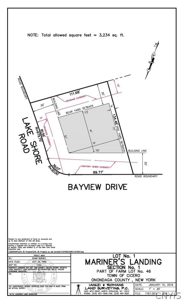 Unique opportunity to purchase this fully developed building lot with Municipal Water, Sanitary Sewer, Natural Gas and Electric all serving the lot. Great opportunity for home builders or for buyers that want to secure the location and choose their own builder. Enjoy a view of Oneida Lake across Lakeshore Rd. Town of Cicero - William Memorial Park is about 1,000 feet from the property offering a swimming beach, playground, pavillions and a gazebo for summer fun and recreation. For more info copy this link to your browser. https://cicero.recdesk.com/Community/Page?pageId=4013 30MPH speed limit on this section of Lakeshore Rd. Corner lot at Lakeshore Rd entrance to Mariner's Landing.
